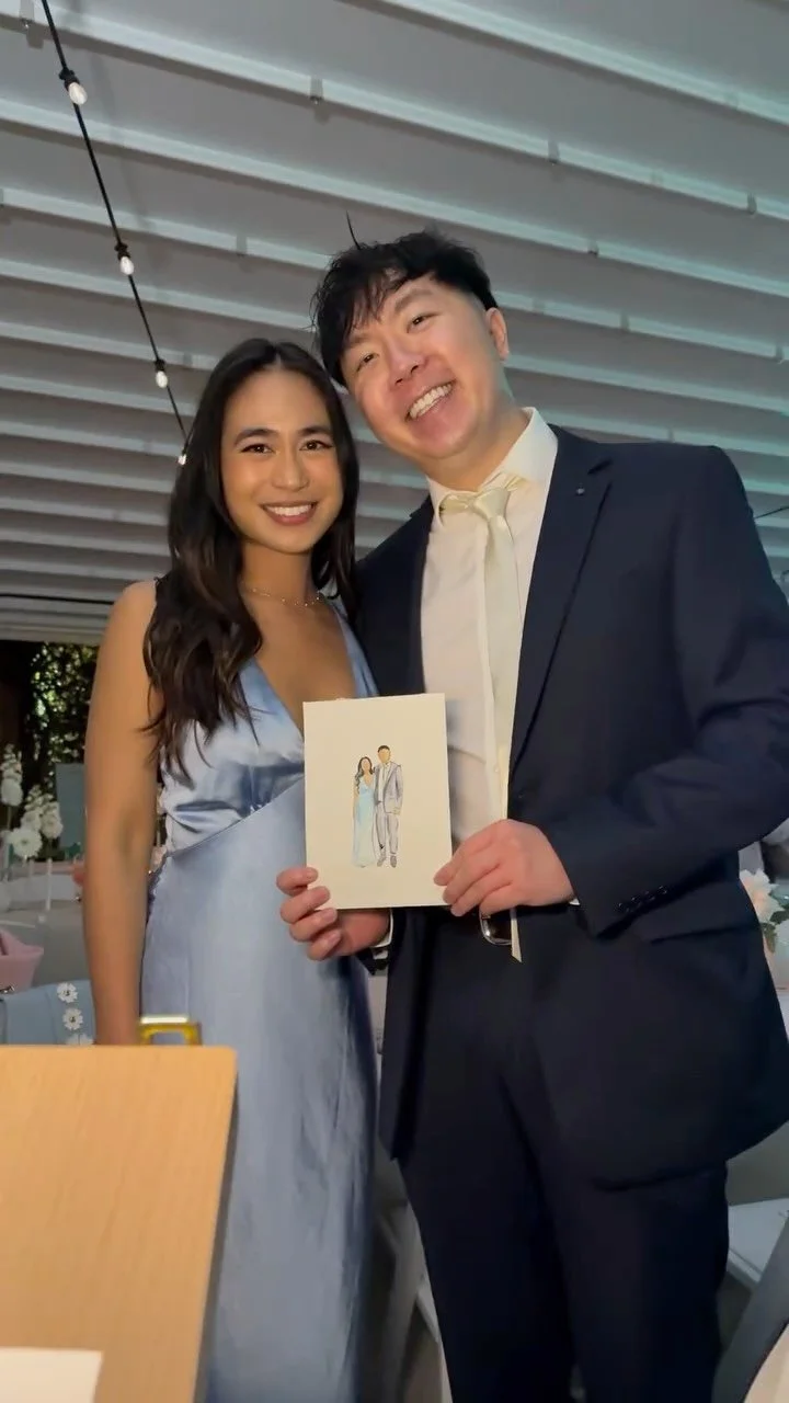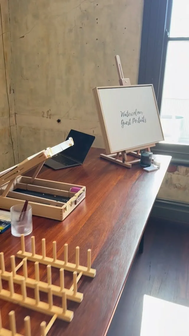I create A5 watercolor portraits of your guests on your special day, as a keepsake they’ll treasure forever. It’s entertainment and a heartfelt gift, all in one! During the time I am at your wedding any guests who wish to be painted can visit me at my table, I photograph and then paint them! This can be done individually, in couples or in groups.